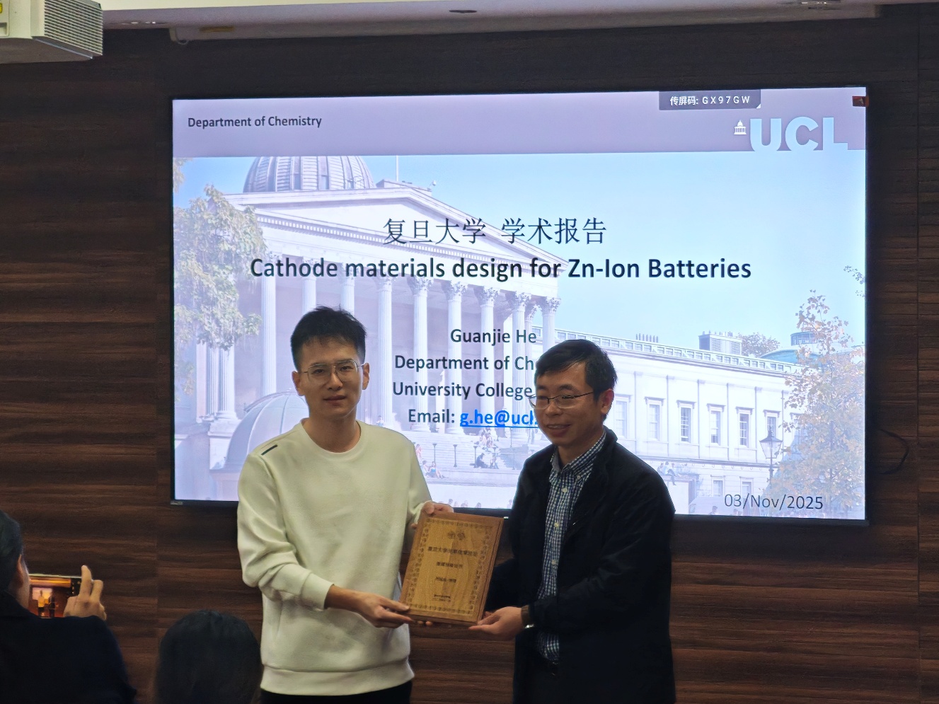 11月3日下午,“ag真人 建系百年系列学术报告之光华论坛第八讲”在江湾校区化学楼A7032报告厅顺利举行。本次论坛特邀伦敦大学学院何冠杰教授作了题为“高性能水系锌离子电池的正极材料设计”的学术报告,ag真人 李伟教授主持报告会,并代表主办方为何冠杰教授颁发荣誉证书,现场近百名师生参与交流,共同聚焦水系锌离子电池领域的前沿技术与研究突破。