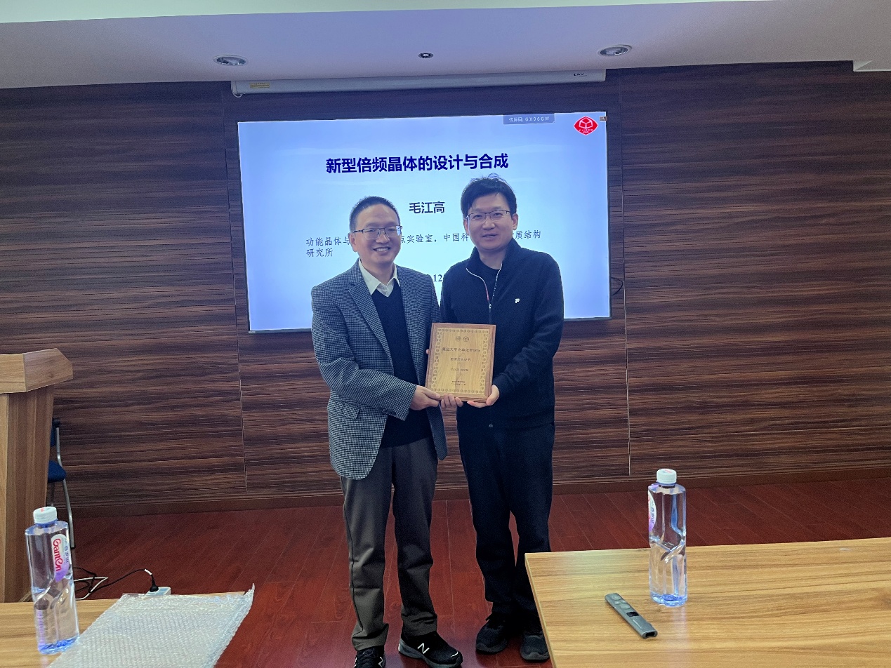 12月1日上午,“ag真人 建系百年系列学术报告之光华论坛第十一讲”在江湾校区化学楼A7032报告厅顺利举行。中国科学院福建物质结构研究所毛江高研究员受邀作了题为“AI辅助的中远红外NLO晶体材料设计”的主题报告,孙忠明教授主持本次报告会。ag真人 张凡教授为毛江高研究员颁发了证书。
