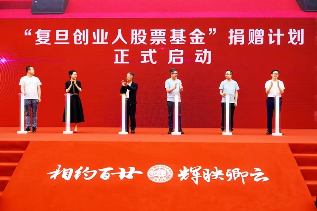 2025年5月24日,蔡彤、汪新芽、江岳恒、郭振荣、杨进在返校大会上正式宣布启动“复旦创业人股票基金”
