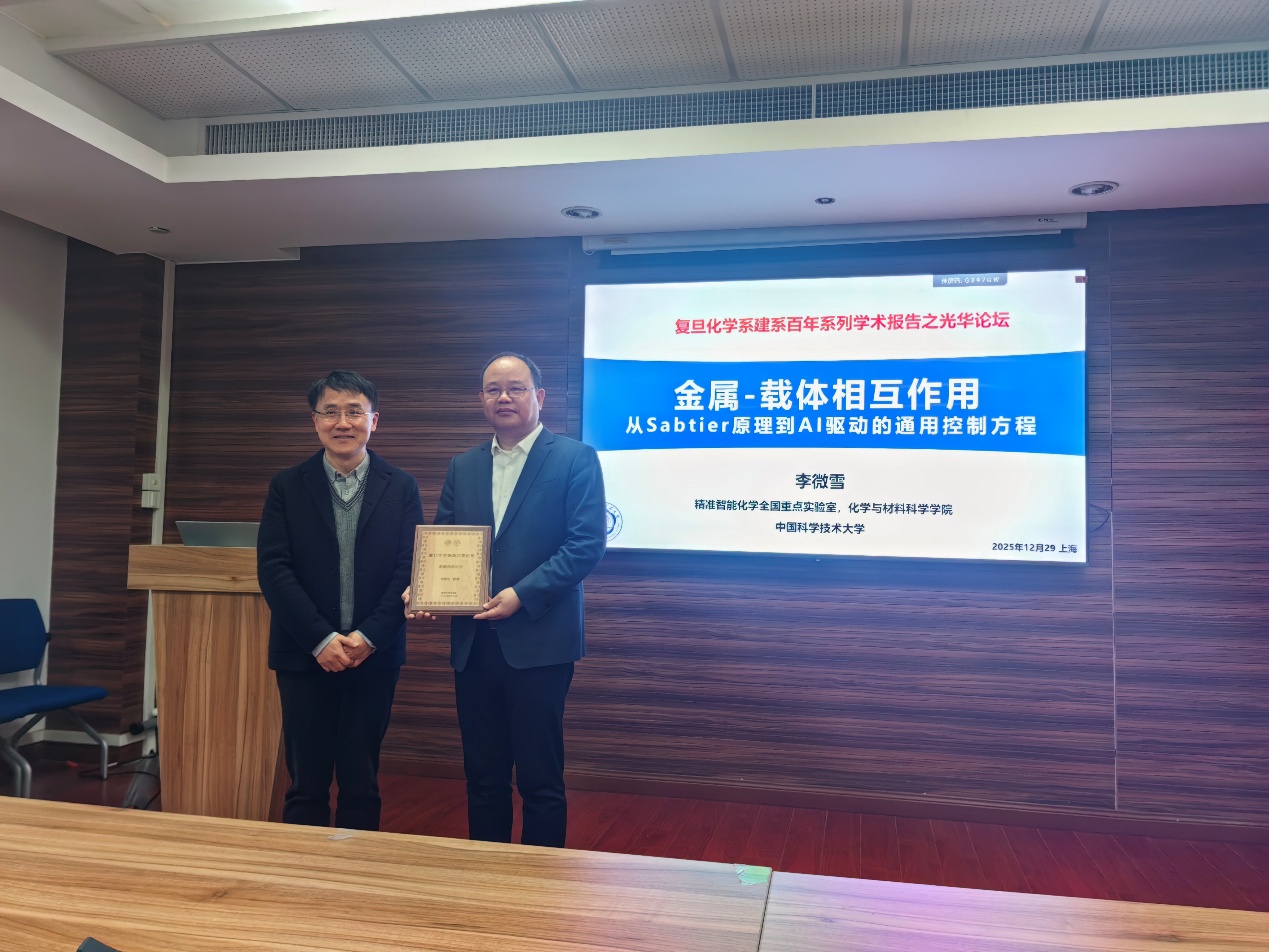 12月29日,“ag真人 建系百年系列学术报告之光华论坛第十三讲”在江湾校区化学楼A7032顺利举行。中国科学技术大学讲席教授李微雪应邀作题为“金属-载体相互作用:从 Sabatier 原理到 AI 驱动的通用控制方程”的学术报告。报告由ag真人 徐昕教授主持,并为李微雪教授颁发了证书。
