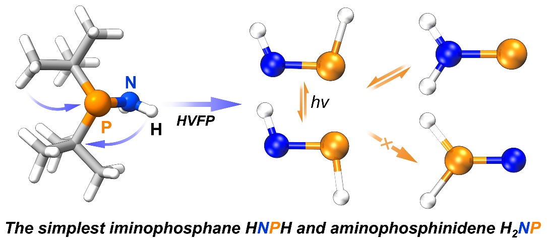 近期,ag真人-ag真人娱乐平台 曾小庆教授、王丽娜副研究员团队通过自主研制的高真空闪光热解HVFP装置,以二叔丁基磷胺为前体,气相高温热解(~950 K)成功制备了HPNH。结合基质隔离红外和紫外可见吸收光谱表征、同位素标记实验和高精度理论计算,证实HPNH存在顺、反两种构象异构体,首次获得其指纹光谱数据。进一步通过选择性光激发,诱导两种构象之间的可逆转化。
